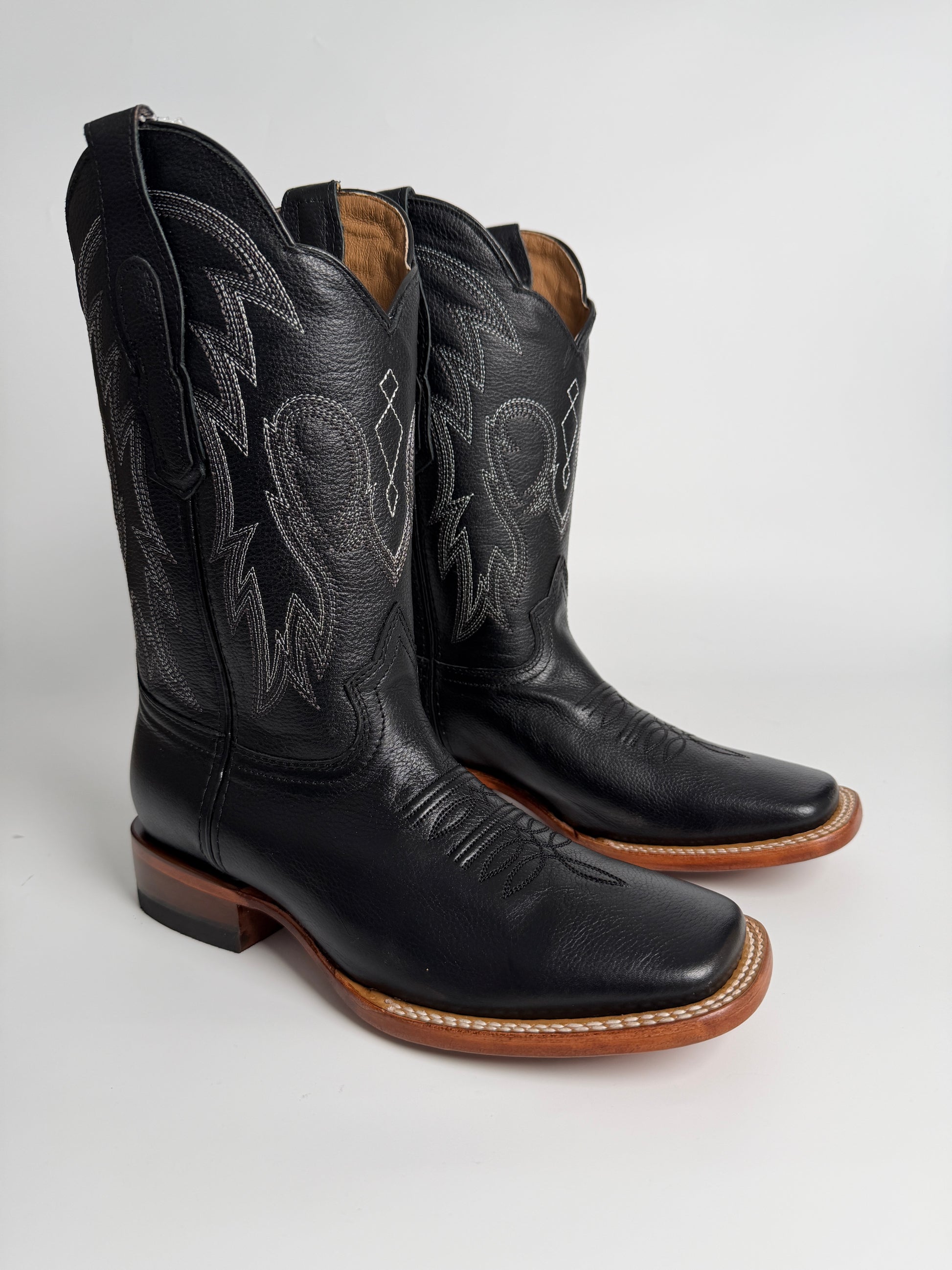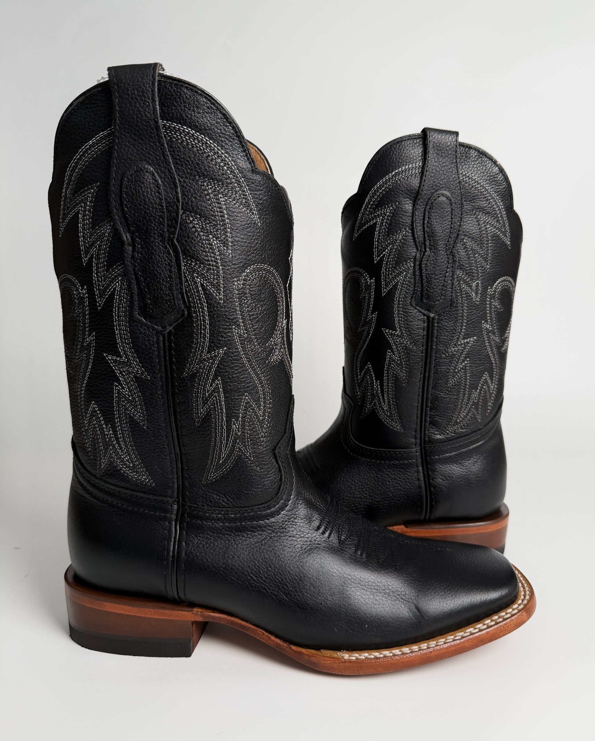 Mens western pull on boots leather stacked heel square toe black leather western stitching. Expertly crafted with high-quality leather and a stacked heel, these pull on boots are a must-have for any western style enthusiast. The sleek square toe and intricate stitching add both style and durability, making them a perfect addition to your wardrobe.